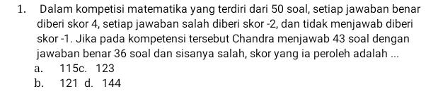 Posting Komentar untuk "Soal Ujian Matematika Terdiri Dari 50 Soal Peserta Akan Mendapat Skor 4 Untuk Setiap Jawaban Benar / Dalam Kompetisi Matematika Yang Terdiri Dari 50 Soal Peserta Akan Mendapat Skor 4 Untuk Setiap Jawaban Benar Skor 2 Untuk Setiap - +62 896 2052 4812 (kak fikri) id line:"